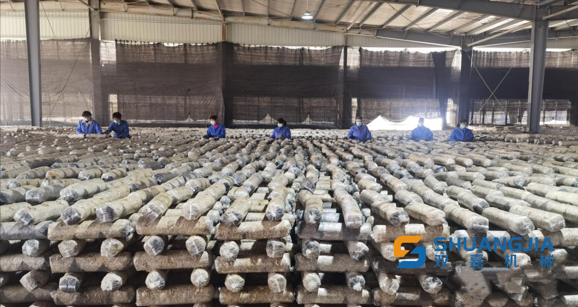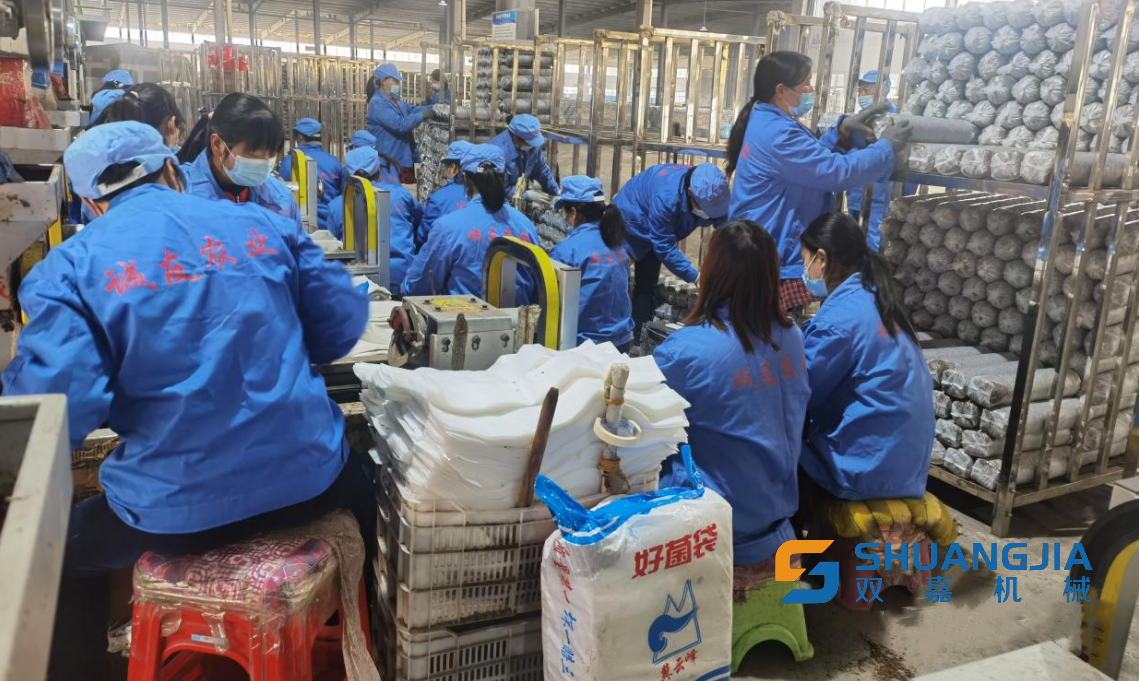 伴隨著機(jī)器的轟鳴聲,工人們正在裝袋、轉(zhuǎn)運(yùn)、滅菌、上架,整個(gè)車間一派繁忙景象。大棚內(nèi),成千上萬的菌棒猶如“甲士”一般整齊排列,場(chǎng)面壯觀,“躍躍欲試”的小香菇正在“探頭張望”。