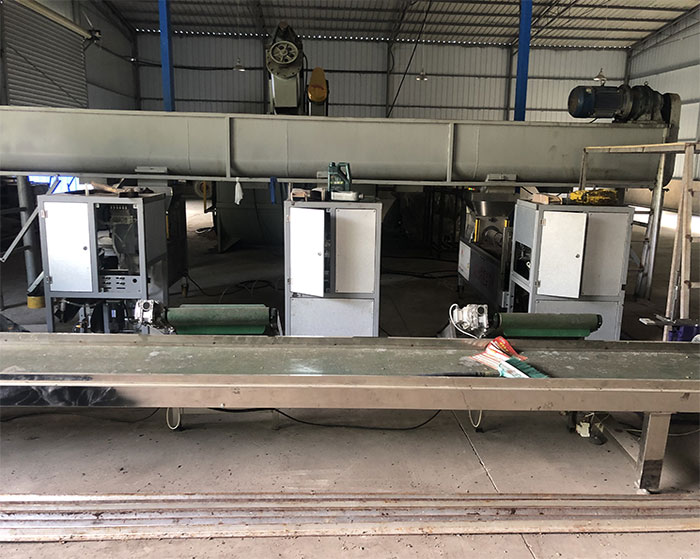 提升機(jī)→布料機(jī)開起裝袋機(jī)