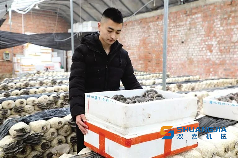 合作社負(fù)責(zé)人王金山介紹,種植基地每畝產(chǎn)量20噸左右,一年可產(chǎn)兩到三茬成品蘑菇,效益十分可觀?!拔覀儗⒂衩装舴鬯?,摻入麩皮、白灰,發(fā)酵后裝入塑料袋,經(jīng)過高溫消毒后進(jìn)行接種就可以形成菌棒?!蓖踅鹕秸f,“等菌棒約生長一個半月后完全變成白色就能長出蘑菇,可連續(xù)生產(chǎn)5至6個月,直至養(yǎng)分耗盡,每畝可放置菌棒約兩萬個。菌棒是蘑菇生長的培養(yǎng)基,能為蘑菇提供充足的營養(yǎng)?!?/p>